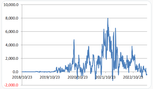 大和レバナスの1週間平均資金流出入金額だが、名実ともにレバナスブームは終焉。