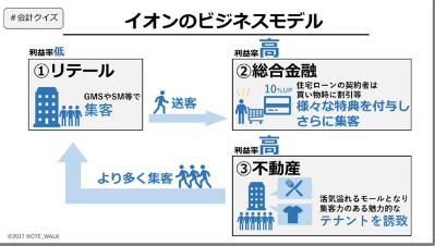 2:個人向けは「金融事業」で儲ける。イオンはGMSやその他ショッピングモールが便利であるほど、日々の買い物だけでなく「住宅ローンの支払い」や「携帯の支払い」をイオンカードで行うインセンティブがある。だからGMSなどは可能な限り安く便利にする。こちらも慈善事業や公共事業としていてやっているわけでではない。
