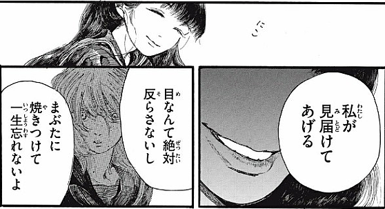 普通に彼女はひどいことしかしていないのだが、それでもいじめられっこ側としては、いじめられてじわじわしんでいくよりも救われたのだろう。悪魔と化した主人公がひどいのなら、それよりもっと現状のほうがひどいというのが救いようがない。