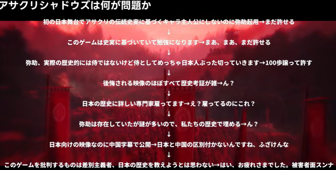 - 日本のオタクは「史実に基づいていない(かもしれない)」という点はそれほど問題視しておらず、純粋に「日本軽視しておきながらそれを指摘されたら逆ギレするUbiSoftの傲慢さ」を問題視している